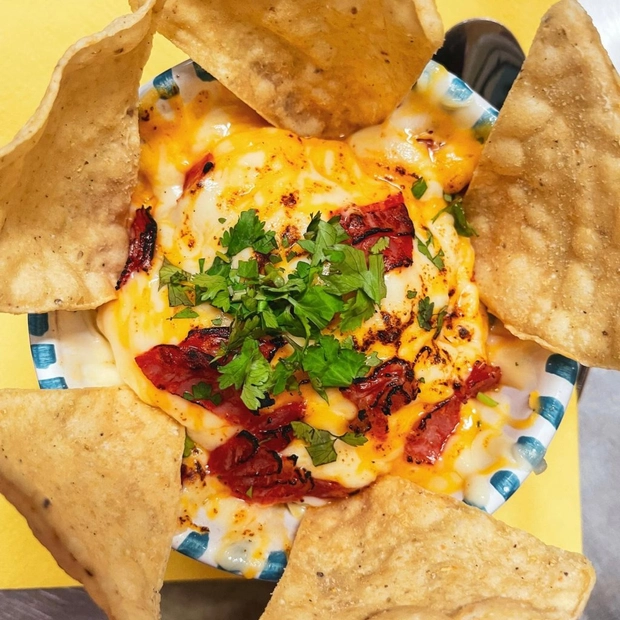 Kukuřičná tortilla se zapečeným sýrem, čedarovou omáčkou a salátkem pico de gallo
