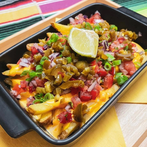 Smažené hranolky s čedarovou omáčkou, jarní cibulkou, salátkem pico de gallo a jalapeňos