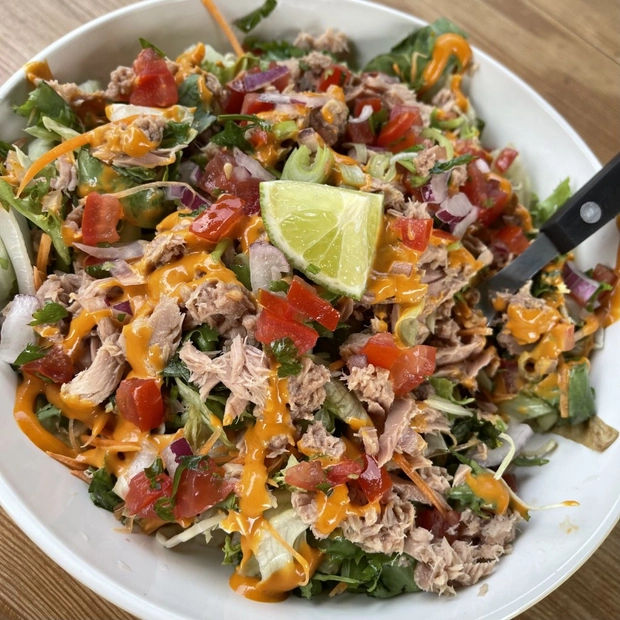 Mix salátů s tuňákem, mangem, okurkou, rajčaty, cibulí, jarní cibulkou, a domácím dresingem
