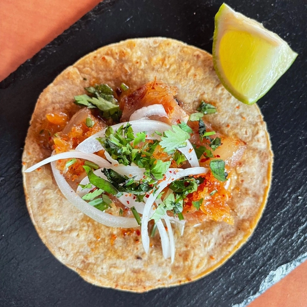 Kukuřičná tortilla s pečeným bůčkem na česneku, čerstvá cibule, koriandr
